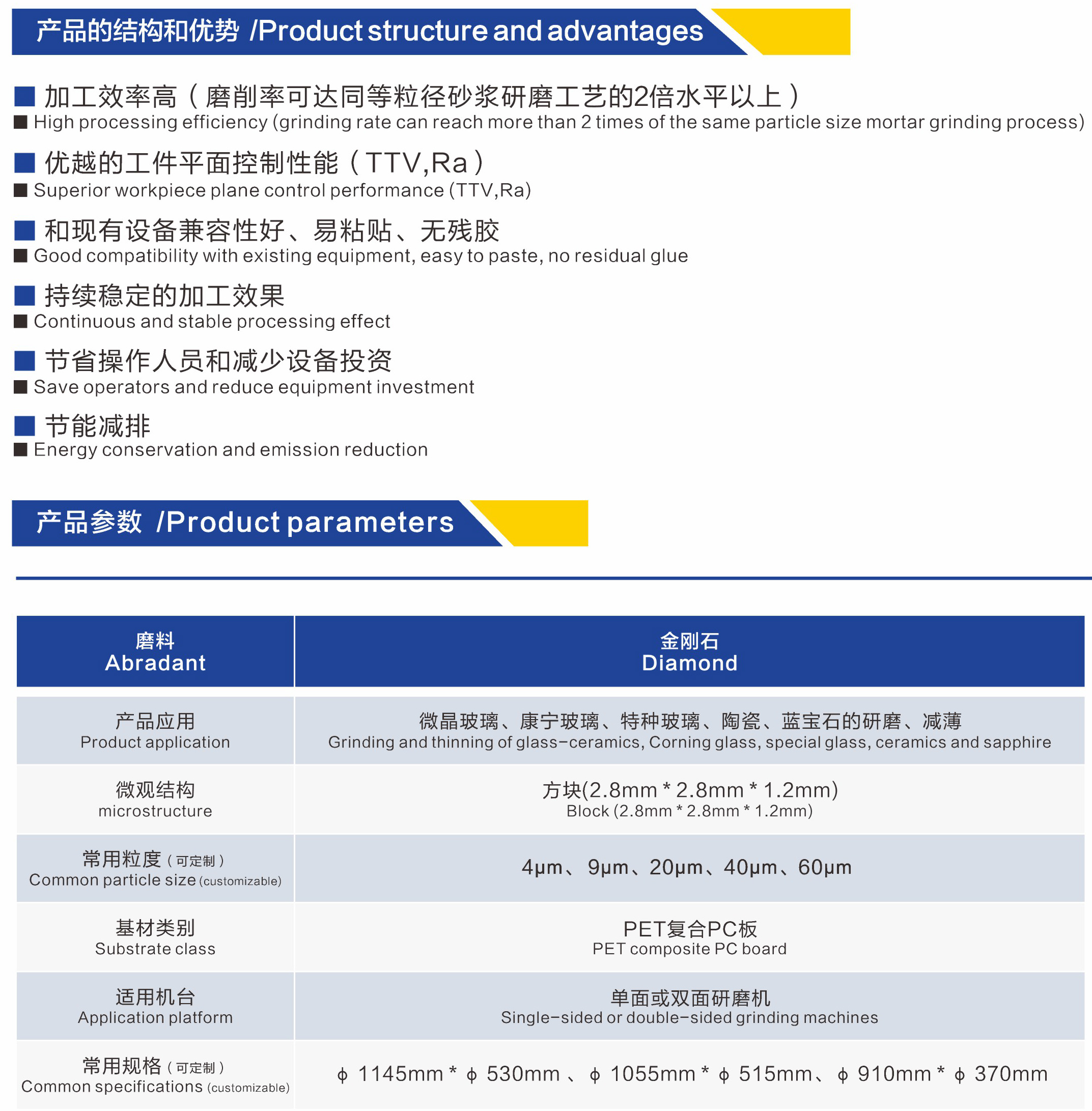 圣高鉆石研磨墊是電子精密研磨的[敏感詞]解決方案,目前普遍使用的5種類型,根據(jù)粒徑分為4mic、9mic、20mic、40mic、60mic(可定制),主要應(yīng)用于微晶玻璃、康寧玻璃、手機玻璃蓋板減薄,攝像頭保護后蓋減薄,光學(xué)平面玻璃,藍寶石窗口片,碳化硅半導(dǎo)體片,陶瓷片,以及各種混合產(chǎn)品的冷加工,研磨減薄。
